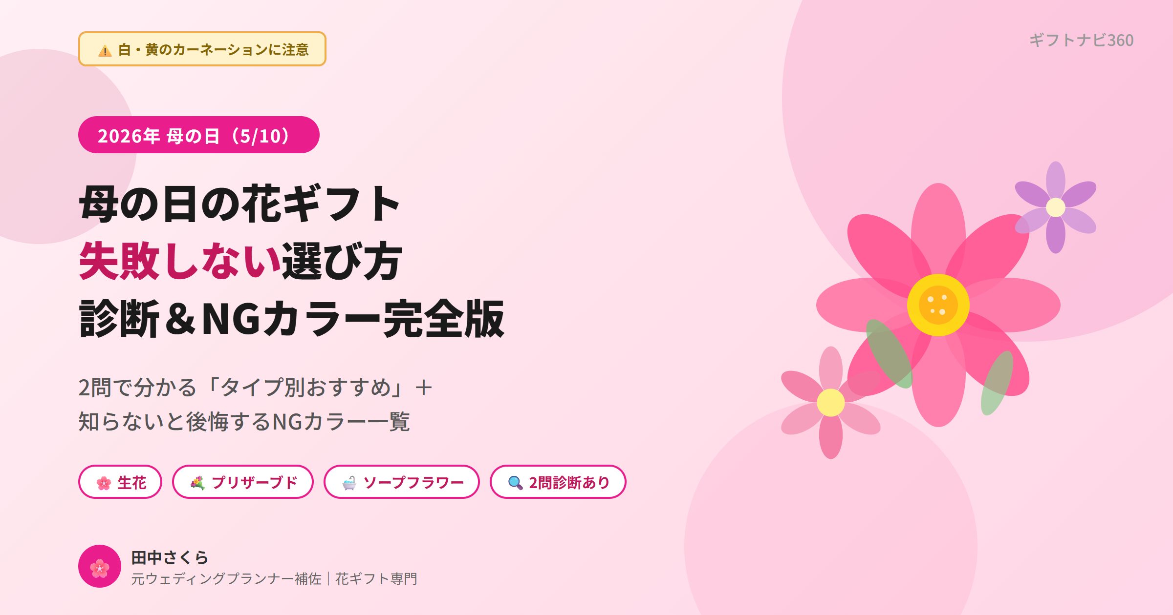 この記事では2問に答えるだけでお母さんへの花タイプが分かる診断と、各タイプの特徴・選び方ポイント・おすすめ商品をまとめました。2026年の母の日(5月10日)に間に合うよう、今すぐ選んでしまいましょう。