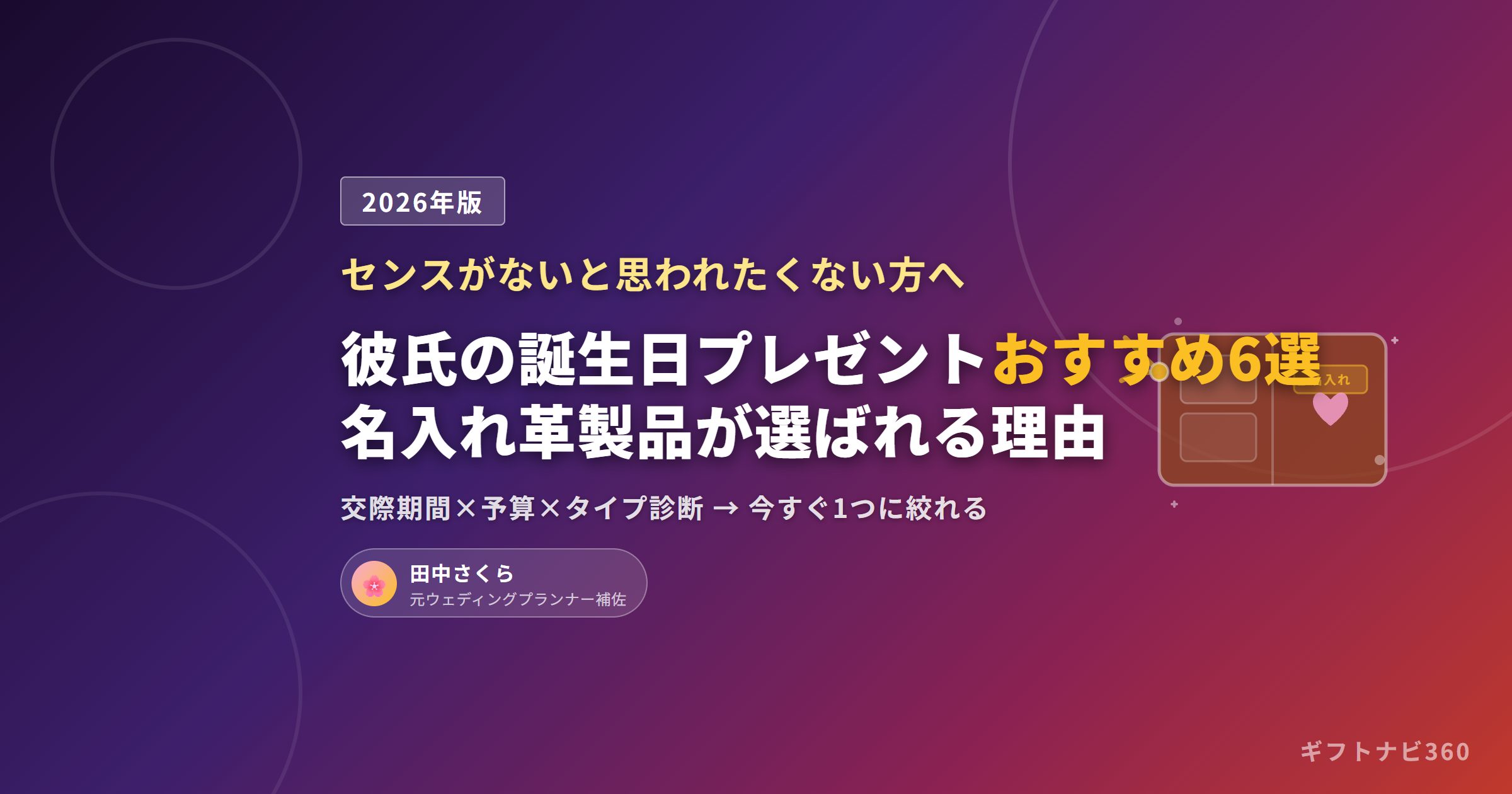 この記事では、交際期間・予算・彼氏のタイプの3軸でプレゼントを絞り込める診断と、本当に使い続けてもらえる6商品をまとめています。中でも名入れ革製品が毎年選ばれる理由を、元ウェディングプランナー補佐の視点からお伝えします。比較して今すぐ決めたい方に、この1記事で完結するよう構成しました。